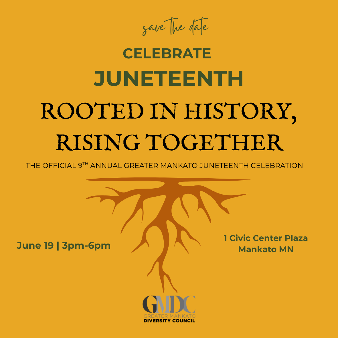 Save the date for the 9th Annual Greater Mankato Juneteenth Celebration on Friday, June 19th at the Civic Center Plaza Front Lawn, from 3:00-6:00pm. This year’s theme is Rooted in History, Rising Together.